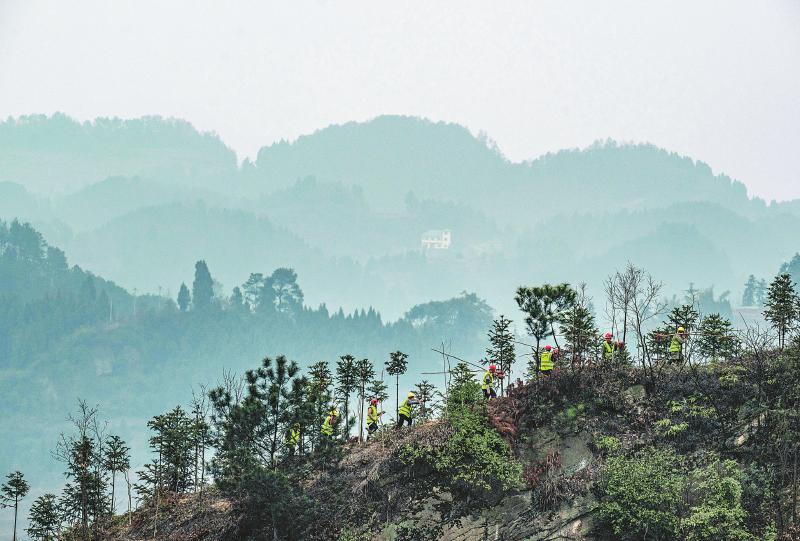 3月9日,护林员们扛着树苗行进在古蔺县太平镇走马村的大山上。