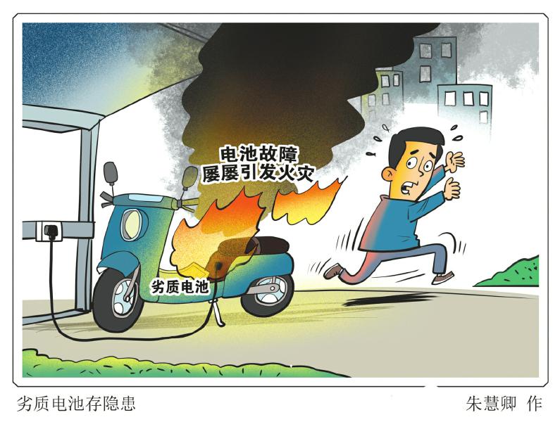 2023年,国家消防救援局共接报电动自行车火灾2.1万起。数据显示,电池单体故障等问题是导致电动车电气火灾的重要原因,这需要引起我们的高度警惕,尽快制度性阻断劣质电池流入市场。朱慧卿 图