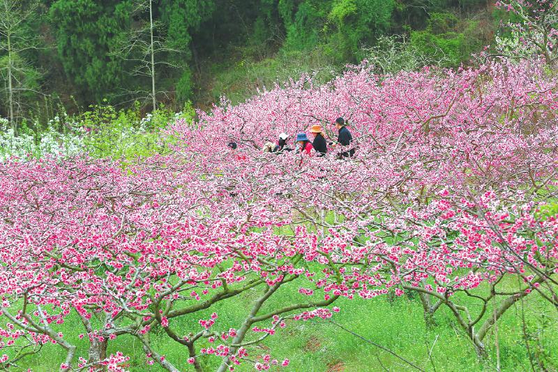 3月14日,广汉市第22届桃花节在广汉市连山镇开幕。图为游客流连在桃花丛中。广汉市委宣传部供图