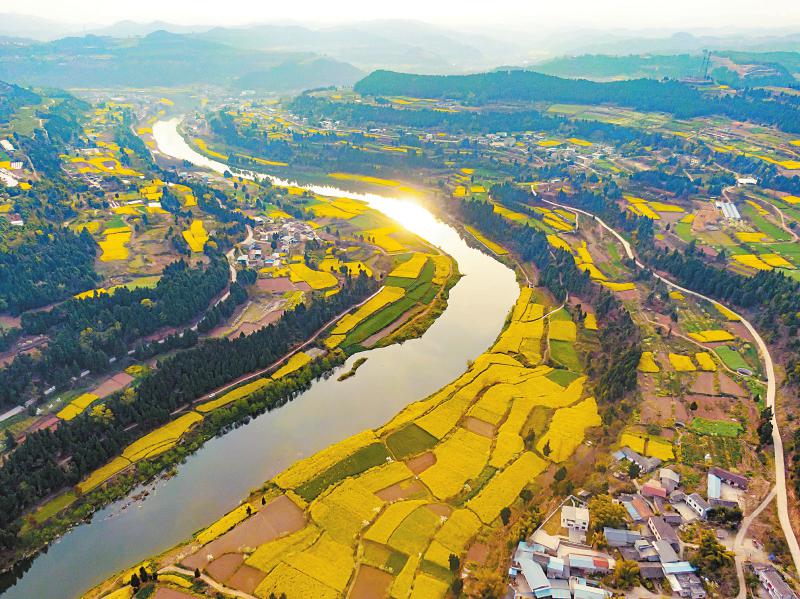 • 3月22日,在流经德阳市旌阳区双东镇的凯江河两岸,金色的油菜花、洁白的李花竞相绽放,花海与村庄、河流相映成趣,绘成一幅美丽的山水田园画卷。 唐渝川 摄(C视觉)