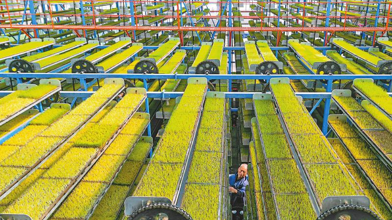 3月22日,在眉山市彭山区公义镇的数智水稻示范基地,一排排循环式智能育秧机正全天候运行,农技人员正在观察水稻秧苗生长情况。玻璃大棚外,工人们利用秧盘智能传输带将育秧车间长出嫩芽的秧盘运送田间,通过补土、施肥、覆膜进行水稻秧苗培育。 翁光建 摄(C视觉)