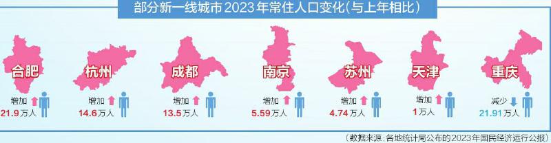 记者梳理发现,人口规模不及成都的合肥和杭州近几年表现亮眼。人口接近1000万人的合肥,2023年常住人口相比上年增加了21.9万人,人口1200多万人的杭州增加了14.6万人,均高于成都。“在与许多一线城市和新一线城市的比较中,成都增幅虽然不是最高,但排名依然较为靠前。”杨成钢认为,产业活力、城市环境、城市文化等多方面的综合因素,使成都依然具备着较强的人才吸纳和人口吸附能力。