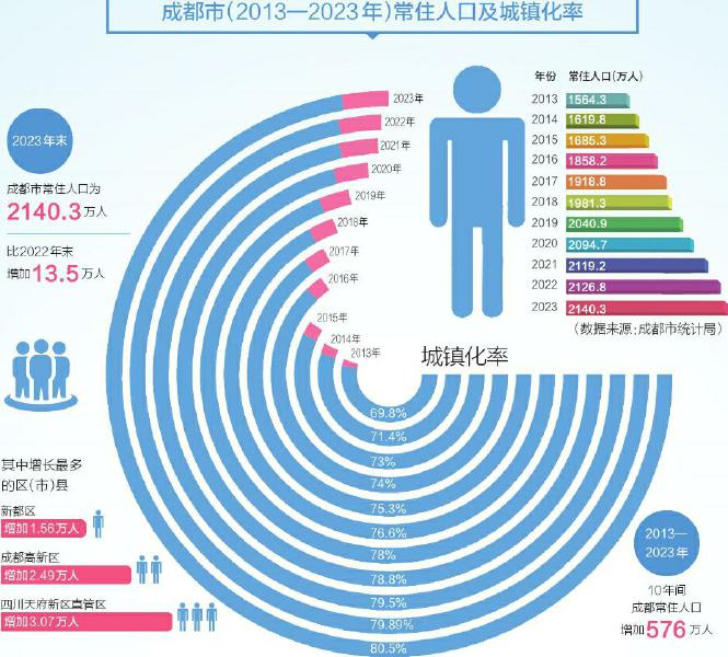 3月19日,成都市统计局发布成都人口主要数据。2023年末,成都市常住人口为2140.3万人,比2022年末增加13.5万人。