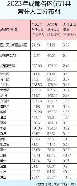 在成都市统计局3月19日公布的2023年成都市常住人口中,只有20个行政区(市)县的数据,四川天府新区直管区、成都高新区和成都东部新区三个城市新区并未单独列出。记者通过查阅成都市统计局官方微信公众号公布的相关数据,梳理出成都23个区(市)县常住人口增长情况,增长最多的分别是四川天府新区直管区、成都高新区和新都区,分别为3.07万人、2.49万人和1.56万人。