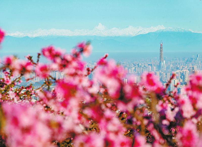 3月25日,成都市区迎来好天气。在龙泉山上能见到四姑娘山与盛开的桃花同框,成为这个季节的新风景。 四川日报全媒体记者 何海洋 摄