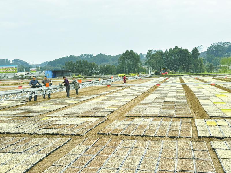 平田、摆盘、裹泥、撒谷、盖膜……3月21日,犍为县罗城镇二龙村君哥家庭农场集中育秧示范基地里,村民有条不紊地劳作。