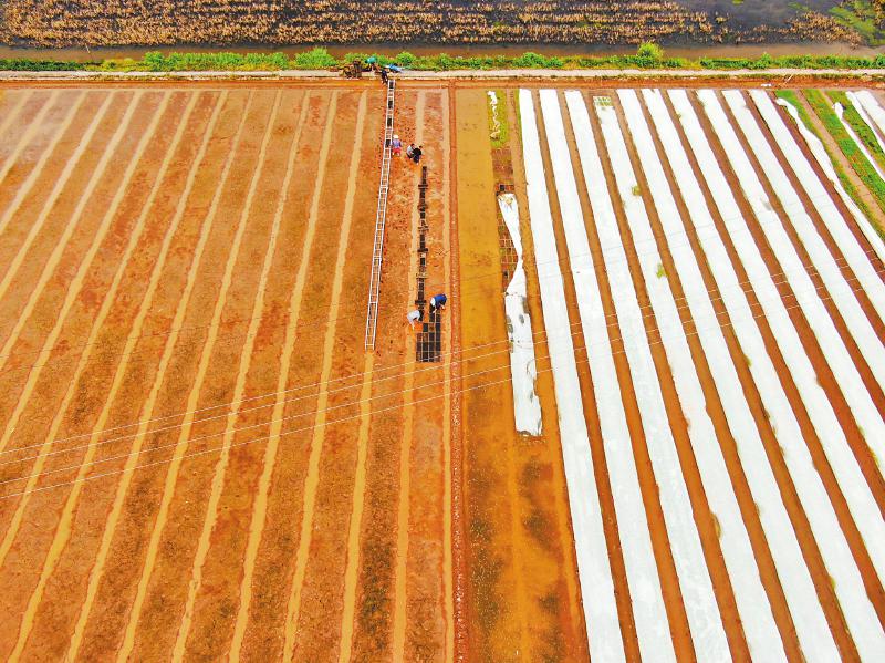 3月27日,在宜宾市长宁县竹海镇鑫海农机专业合作社水稻育苗基地,农户通过秧盘运输履带机,将暗化育秧技术催芽的秧盘移至秧床,进行育苗。当前,正是水稻育秧的好时节,长宁县各地抢抓农时,积极推广机械化流水线育秧、暗化育秧等现代农业新技术,紧锣密鼓开展水稻集中育秧。 张宝林 摄(C视觉)