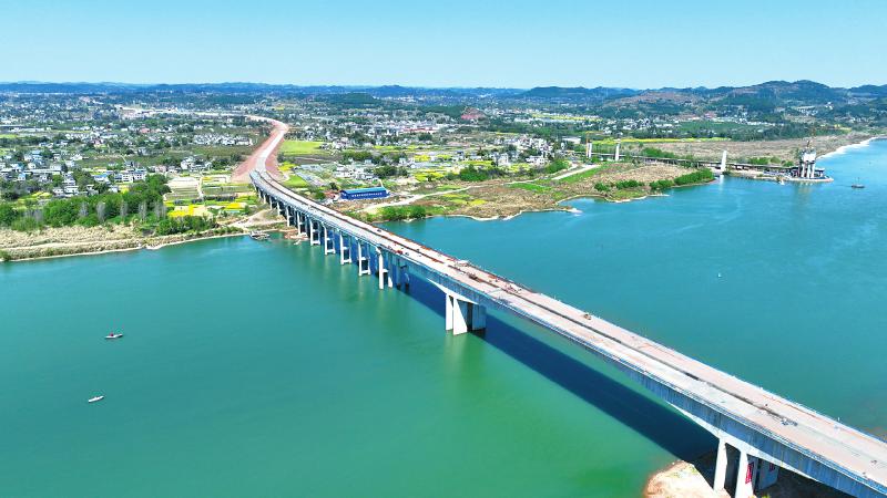近日,南充过境高速公路项目(东北段)嘉陵江特大桥实现双侧贯通。3月25日,记者在位于南充市顺庆区搬罾街道附近的施工现场看到,工人忙着完成桥面铺装作业。南充过境高速公路项目建成后,将与成南扩容高速形成闭合环线,对南充拉大城市骨架、拓展城市空间、分流过境车辆具有重要意义。 黎涛 摄