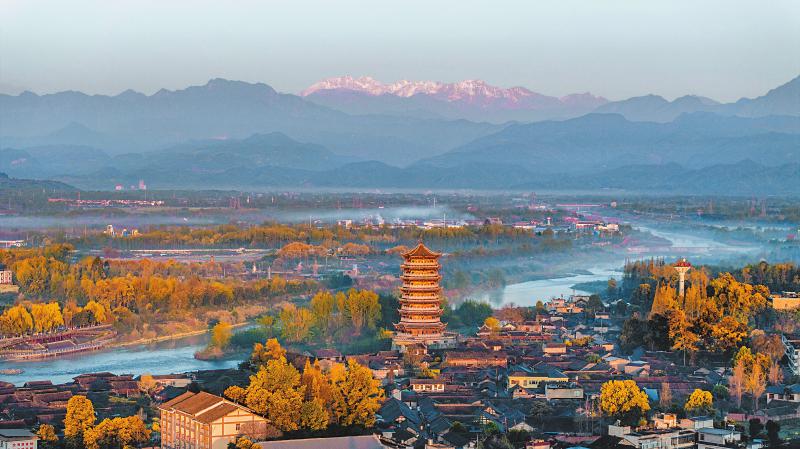 连日的晴好天气,让雪山频频出现于人们的视野。3月29日,崇州市元通古镇与远处的雪山再次“同框”,雪山在晨辉的照射下闪耀着金色的光芒。 李旭 摄(C视觉)