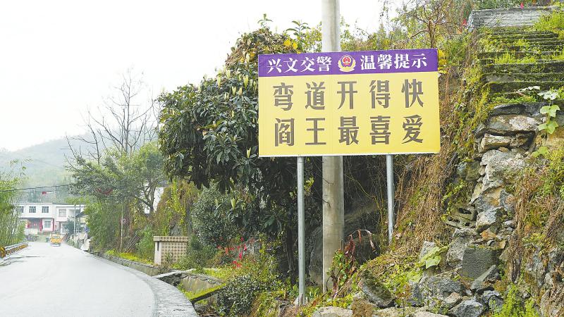 顺着兴威路向南继续行驶,路边交通提示牌的“画风”开始突变。在兴文县麒麟苗族乡居民王女士的家门口,记者看到网友所说的“弯道开得快,阎王最喜爱”的交通提示牌。