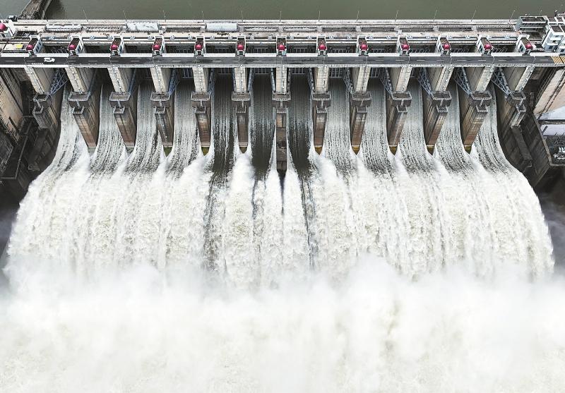 4月5日,闽江流域洪峰安全通过福建水口水电站大坝(无人机照片)。近日,福建闽江流域上游出现明显降雨过程。为保障闽江安澜,福建水口发电集团有限公司迅速响应,水口水库于4日23时开闸泄洪。 新华社记者 林善传 摄