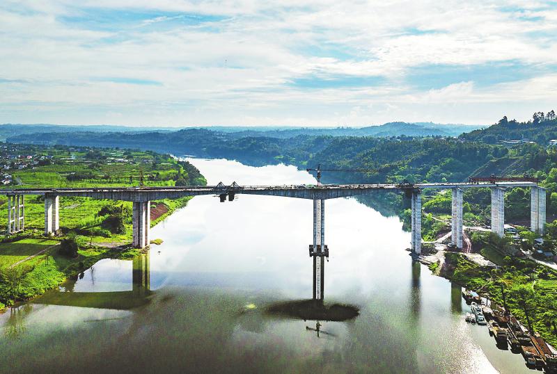 4月3日,正在加快建设的广安市大龙渠江特大桥。大龙渠江特大桥位于广安区,全长940米,宽26.5米,是广安市区连接广安火车站、新桥工业园区、前锋工业园区、广安港等地的快速通道重点控制性工程。大桥建成后,将进一步方便两岸群众出行,对调整和优化区域产业结构、促进渠江两岸经济加快发展具有重要意义。 张国盛 摄(C视觉)