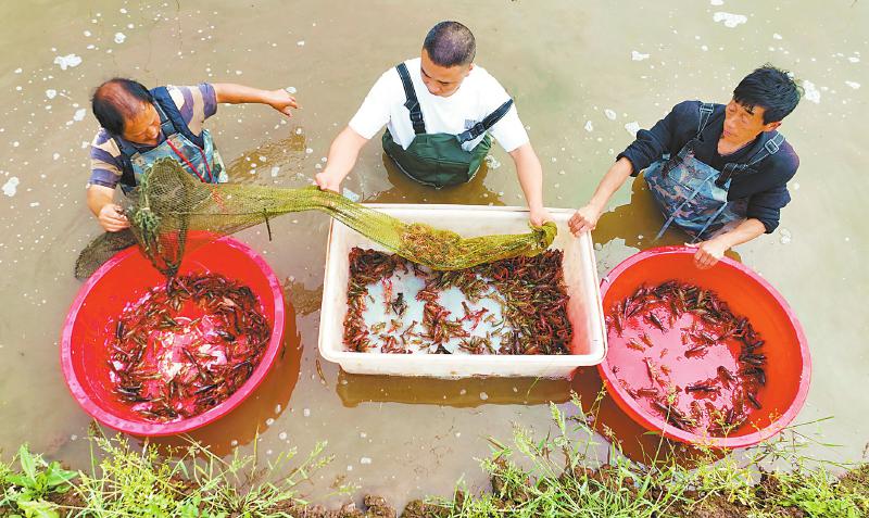 4月6日,在眉山市仁寿县曹家镇共峨村的稻虾共养基地,村民正在打捞小龙虾。近年来,曹家镇积极推广“稻虾共养”生态种养模式,将低洼田、冷浸田改成稻虾种养地,由养殖专业合作社负责苗种放养、饲料管理、水质调节、病害防治、销售等全链条服务,水稻与小龙虾共生共养,不仅有效地减少了化肥、农药使用量,还达到了“一水双用、一田双收”的效果,助力农民增收、农业增效。 潘建勇 摄(C视觉)