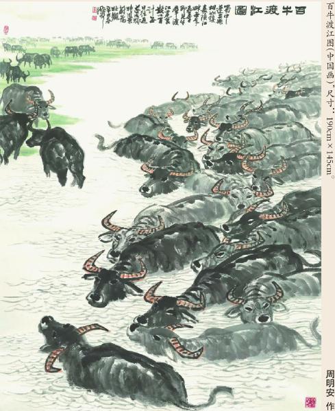 著名画家周明安以画虎著称于蜀中画坛,不过就画面整体气韵和美感力量而言,他笔下的其他飞禽走兽同样值得称道,也在不断地求新求变中得到升华。周明安不只追求形似,即动物结构、皮毛、动态的准确反映,他更追求神似,注重气势的表达以及笔墨的酣畅和技法的完美,以随意的书写性成就自然而然的情感倾诉。这幅取材于南充市蓬安县的《百牛渡江图》,就生动地展现出雄浑壮美的正大气象。观其皮毛,察其筋骨,究其情态,熟其灵性,这些细微的观察与体悟,让他的画笔使转自如,随心所欲于各种动物的物情物态中,更显露出艺术家心中温暖的情怀。 (余如波)