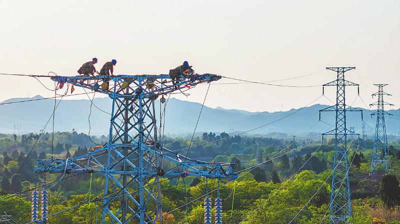 4月11日,在眉山市仁寿县普宁街道尹家湾N78至N79放紧线施工现场,电力施工人员在40多米高空开展放线安装作业。翁光建 摄(C视觉)