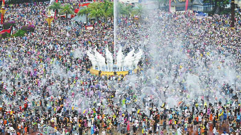 4月15日,人们在景洪市泼水广场上参加泼水狂欢活动。当日,云南省西双版纳傣族自治州举行泼水狂欢活动,人们欢聚在景洪市泼水广场,用相互泼水的方式互送祝福,庆祝泼水节。