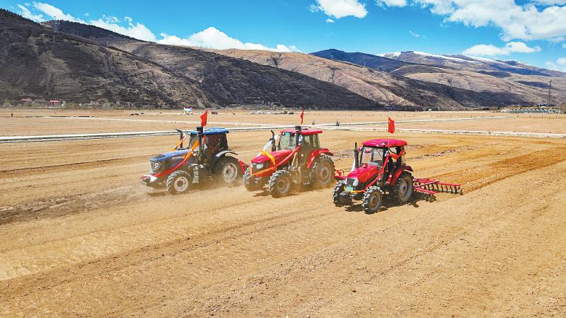 随着高标准农田建设和农业机械的普及,炉霍县越来越多的农区田地逐渐实现机械化。“我们家有30多亩农田,‘二牛抬杠’耕种需要10天时间,10多年前有了手扶式拖拉机,耕种需要5天,现在靠大型‘铁牛’,1天就可结束耕种。”彭措拥登指着田边停放着的数台大型耕种机和旋耕机说。