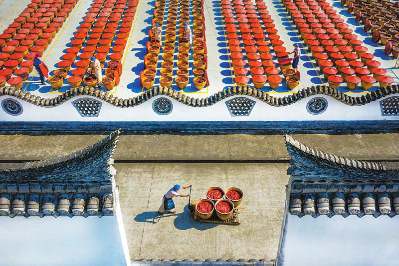 【天府粮仓】二等奖《晒场飘香》 2019年10月18日,工人们在资阳市临江寺豆瓣厂的晒场上翻晒豆瓣酱。 魏前程 摄