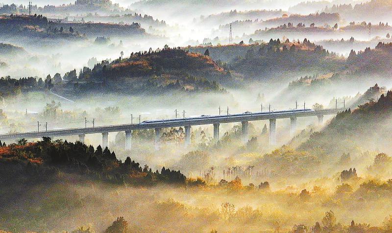 【蜀道之变】一等奖《奔赴新时代》 2023年11月26日,山丘之间晨雾弥漫,一列动车驶过资阳城东新区郊外的大桥。 张天富 摄