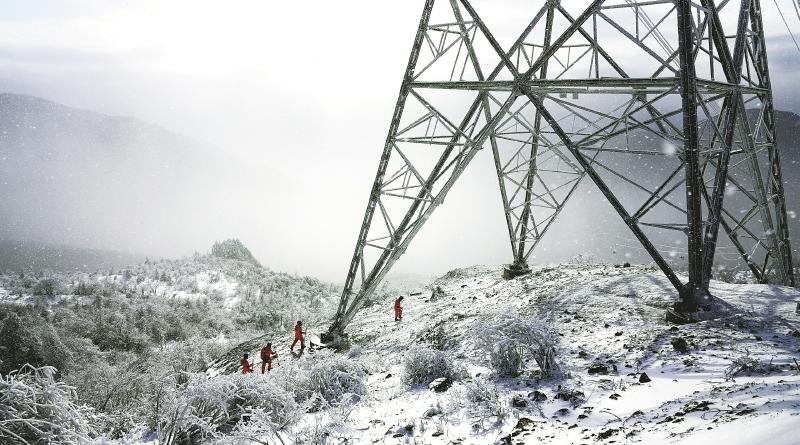 【电亮四川】一等奖《踏雪巡线》 2023年1月16日,国网四川电力送变电建设有限公司电力工人在泸定县海拔3000米的二郎山踏雪巡线。 刘湘钒 摄