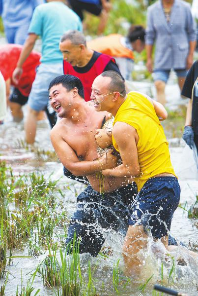 【天府粮仓】二等奖《稻丰鱼肥庆丰年》 2023年9月22日,“天府粮仓”洪雅示范区举行“中国农民丰收节”活动,村民们稻田摸鱼庆丰收。 张锐红 摄