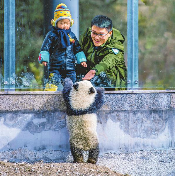 【天府新生活】三等奖《宝贝你好》 2018年2月24日,幼童在成都大熊猫繁育研究基地问候大熊猫宝贝。邬宪初 摄