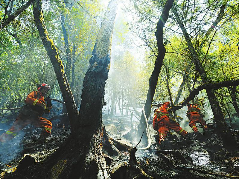 【光影消防】一等奖《清理火场》 2023年6月1日,成都森林消防大队的消防员在海拔3700米的凉山州木里县原始森林里清理火场。程雪力 摄