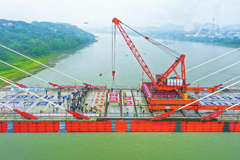4月22日,在泸州市合江县,随着最后一块桥面板精准吊装到位,榕山长江大桥顺利合龙。该桥为高低塔双索面叠合梁斜拉桥,总长1505米,双向四车道,设计时速60公里。通车后,将惠及两岸30余万群众。 牟科 摄(C视觉)