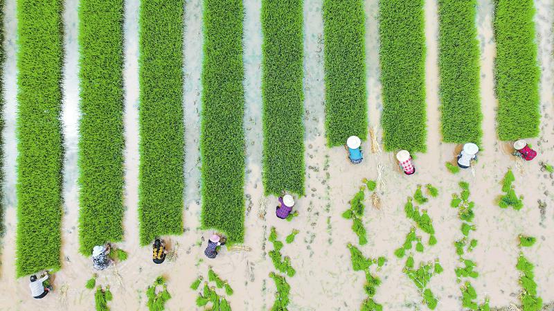 4月23日,在遂宁市安居区三家镇三门村,当地抢抓晴好天气,组织村民完成2000余亩水稻插秧。三家镇今年预计种植水稻5.2万亩,通过不断优化农业产业结构,为打造新时代更高水平“天府粮仓”提供更多优质粮、放心粮。 张勤宝 摄(C视觉)