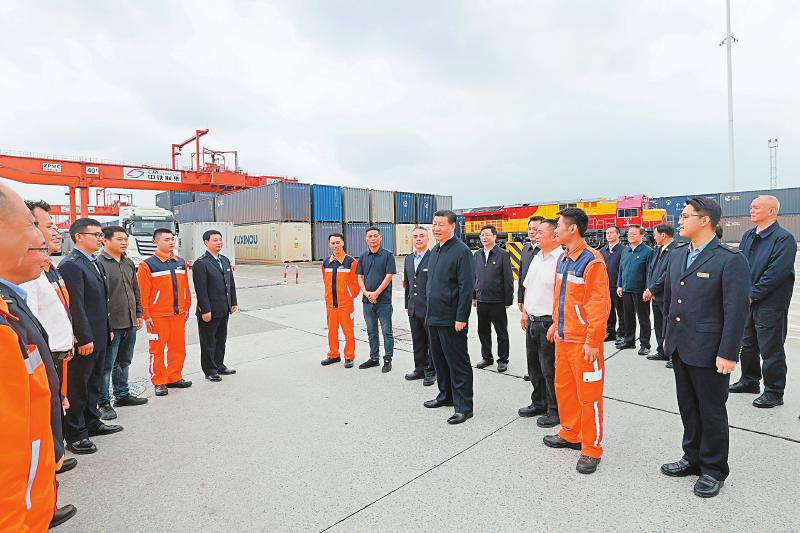 4月22日至24日,中共中央总书记、国家主席、中央军委主席习近平在重庆考察。这是22日下午,习近平在重庆国际物流枢纽园区重庆铁路集装箱中心站,同货车司机、列车司机、装卸工人、场站管理人员等亲切交流。新华社记者 王晔 摄