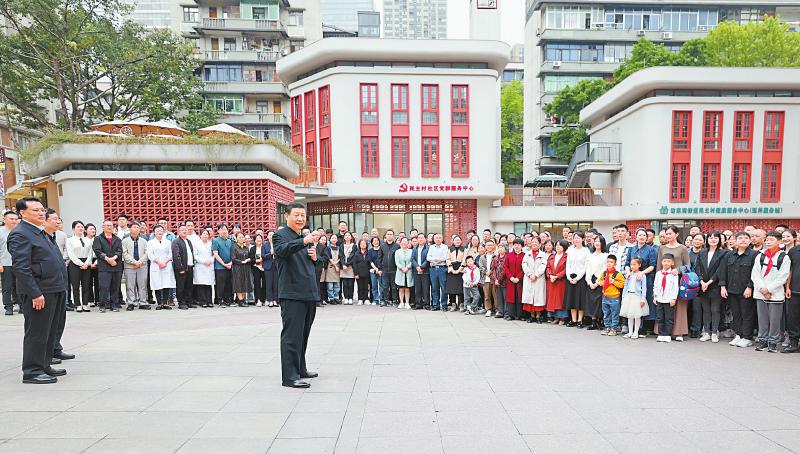 九龙坡区谢家湾街道民主村社区是一个老小区,2022年初启动更新改造项目并纳入全国有关试点。习近平来到这里,察看小区改造和便民服务情况,听取提升基层治理效能、为基层减负情况介绍。他还走进社区食堂,同正在就餐的群众亲切交流,鼓励社区食堂实现可持续发展。习近平指出,老旧小区改造是城市更新的一个重点,也是一项民生工程,既要保留历史记忆和特色风貌,又要解决居民关切的实际问题。要总结推广这方面的成功经验,更好惠及广大社区居民。城市治理的很多工作要靠基层党组织这个战斗堡垒和社区这个平台去落实,要厘清城市社区职责事项,继续推动资源下沉、完善服务设施,强化网格化管理、信息化支撑,提高社区精细化治理、精准化服务水平。