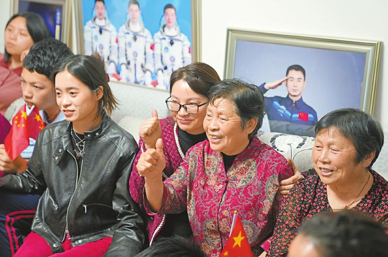 距发射还有1分钟时,叶光富的母亲刘绍林在电视机前下意识地调了调坐姿,并拭了拭眼角激动的泪水。一旁的叶亚丹也与上次一样,一手握住母亲的手,一手轻抚着母亲的肩膀,以缓解老人紧张情绪。