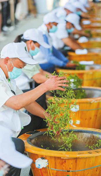 4月28日,在宜宾市屏山县,参赛选手同台竞技,比拼制茶技能。当日,第五届“工匠杯”天府龙芽·宜宾早茶评比活动和手工制作技能竞赛暨技能成果交流会举行,来自宜宾全市的50名参赛选手现场进行手工制茶。 庄歌尔 摄(C视觉)
