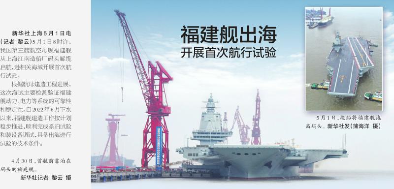 新华社上海5月1日电(记者 黎云)5月1日8时许,我国第三艘航空母舰福建舰从上海江南造船厂码头解缆启航,赴相关海域开展首次航行试验。 根据航母建造工程进展,这次海试主要检测验证福建舰动力、电力等系统的可靠性和稳定性。自2022年6月下水以来,福建舰建造工作按计划稳步推进,顺利完成系泊试验和装设备调试,具备出海进行试验的技术条件。