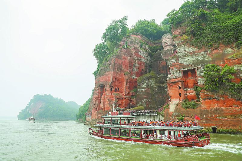 5月3日,游客乘坐游船参观世界文化与自然遗产乐山大佛。 邱海鹰 摄(C视觉)