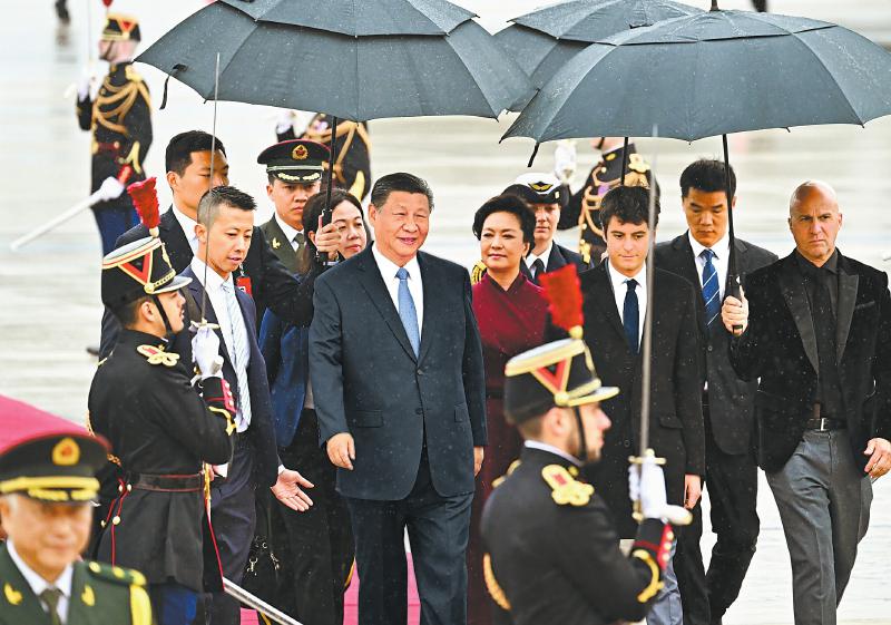 习近平发表书面讲话。习近平指出,我很高兴对法国进行第三次国事访问,同法国人民一道庆祝中法建交60周年。作为东西方文明的重要代表,中国和法国长期以来相互欣赏、相互吸引。60年前,中法两国突破冷战藩篱,建立大使级外交关系。60年来,中法关系始终走在中国同西方国家关系前列。中法关系发展不仅给两国人民带来福祉,也为动荡不安的世界注入了稳定性和正能量。访问期间,我将同马克龙总统就新形势下中法、中欧关系发展,以及当前重大国际和地区问题深入交换意见。我希望通过这次访问,巩固两国传统友谊、增进政治互信、凝聚战略共识、深化各领域交流合作,用历史的火炬照亮前行的路,创造中法关系更加美好未来,为世界和平、稳定、发展作出新的贡献。