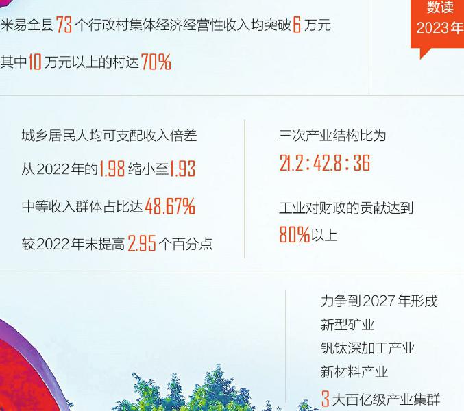 去年,米易全县73个行政村集体经济经营性收入均突破6万元,其中10万元以上的村达70%;城乡居民人均可支配收入倍差从2022年的1.98缩小至1.93;中等收入群体占比达48.67%,较2022年末提高2.95个百分点。