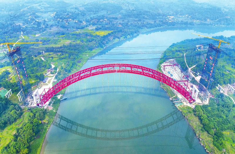 5月7日,航拍正在建设中的镇广高速公路白马渠江特大桥。 镇广高速公路北连陕西省汉中市镇巴县,南连广安市广安区,全线总长156.71公里。白马渠江特大桥是镇广高速公路的重点控制性工程,主跨390米,是一座中承式钢管混凝土拱桥,于2022年2月下旬开工建设,今年1月2日完成钢管拱合龙。 该项目建成后,对完善区域高速交通路网,推动成渝地区双城经济圈建设具有重要意义。 张国盛 摄(C视觉)