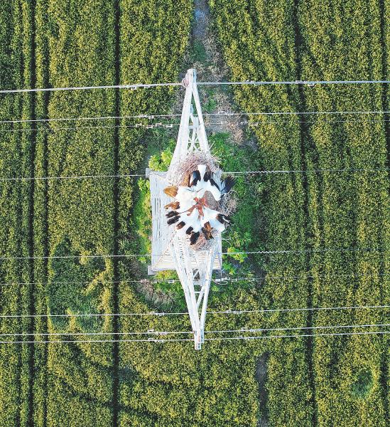 五月十六日,东方白鹳栖息在高邮市周山镇江苏之心地理信息园旁的铁塔上(无人机照片)。近年来,江苏省高邮市周山镇生态环境持续向好,引来“鸟中国宝”东方白鹳栖息、繁衍。新华社记者季春鹏摄