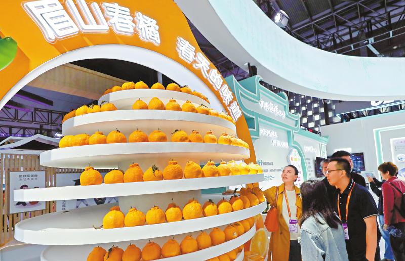 5月12日,参观者在四川眉山展台的橘子展品前驻足观看。 新华社发