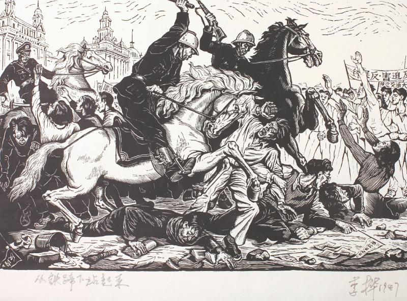 《从铁蹄下站起来》创作于1947年,作者李桦是著名版画家、美术教育家,也是新兴木刻运动的先驱,中国现代版画事业的奠基者。他青年时期就积极从事以救亡图存为己任的新兴木刻运动,创作了一系列现实主义作品。