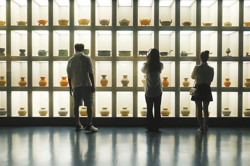 在“5·18国际博物馆日”来临之际,人们走进博物馆,参观丰富多彩的展陈,感受知识和文化魅力。图为5月17日,人们在山东省滕州博物馆参观。 新华社发(孙杨 摄)