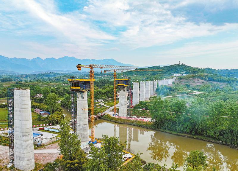 5月16日,西渝高铁(康渝段)站前工程十一标段广安华蓥市庆华镇天龙山1号华蓥河特大桥32号桥墩上,中铁十局的工人在浇筑首联连续梁0号块,标志着该桥进入梁体施工阶段,拉开管段内桥梁上部结构施工序幕。西渝高铁(康渝段)站前工程十一标段管段内有桥梁14座,其中特大桥6座。 邱海鹰 摄(C视觉)