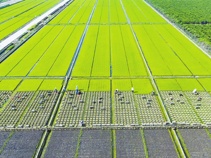 5月19日,在德阳市旌阳区红光印象现代农业产业园集中育秧田里,当地农民正在抢抓农时栽插秧苗,田间地头一派忙碌景象。 唐渝川 摄(C视觉)