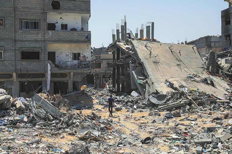 5月21日,在加沙地带南部城市汗尤尼斯,巴勒斯坦人经过以军轰炸后的废墟。新华社发(里泽克·阿卜杜勒贾瓦德 摄)
