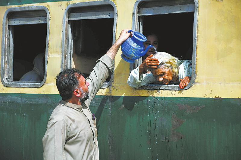 5月22日,在巴基斯坦信德省海得拉巴火车站,一名女子把头伸出车窗,用水浇在头上降温。据外媒报道,巴基斯坦信德省部分地区将遭遇极端高温天气。本栏文图均据新华社