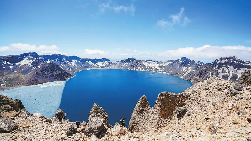 近日,长白山天池冰层逐渐消融,迎来“开冰季”,吸引大量游客前来观赏。据了解,长白山天池海拔超过2000米,冬季长达10个月,每年开冰几乎都在立夏过后。图为5月24日,长白山天池湖水破冰重现。 新华社记者 颜麟蕴 摄