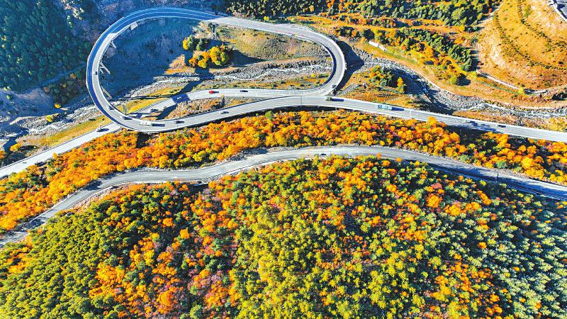 近日,雅江县国道318线沿途进入彩林观赏季,从空中俯瞰,遍山层林尽染。甘孜观察 洛绒尼玛 摄