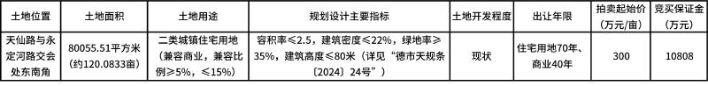 经四川省德阳市人民政府批准,德阳市自然资源和规划局决定以拍卖方式出让天仙路与永定河路交会处东南角国有建设用地使用权,交易组织由德阳市政府政务服务和公共资源交易服务中心实施。现将有关事项公告如下:
