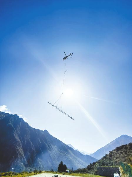随着螺旋桨转动,这架吊着“大尾巴”的直升机缓缓起飞,飞向蔚蓝天空。从空中俯瞰,高山大地尽收眼底,如同空中的眼睛,“透视”地下矿藏情况,“看清”山体内部结构、矿产资源分布等关键信息。